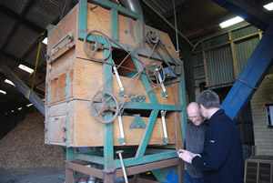 Første led i anlægget en transportsnegl, der transporterer det nyhøstede korn op i tørreriet. I sneglen sørger tætsiddende 2 mm store huller for at fjerne 15-20 procent af ukrudtsfrøene og det meste sand. Tørreriet af fabrikatet Cimber og af gennemløbstypen. Efter tørringen kommer kornet gennem en soldrenser (billedet til højre), der fjerner resterende ukrudtsfrø.