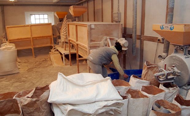 - Renseri: Alt korn køres gennem soldrenser (til at tage små ukrudtsfrø) og aspiratør (som blæser strå og andre lette materialer væk). Korn til møllen køres desuden gennem Damas soldrenser med både blæser, stenfælde og magneter.